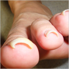 爪が食い込むのを避けるために、爪を深く短く切り込んでしまった方も多いかと思われますが、これは逆効果です。爪まわりの皮膚がさらに爪を覆い、ますます皮膚にくいこんでしまいます。 - 靴からの圧迫